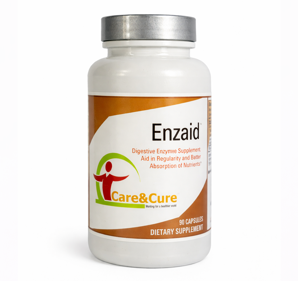 The Care & Cure Proprietary Enzyme Blend targets the five most important categories of digestive work your body performs after every meal. Cellulase breaks down plant fibre, unlocking the nutrients inside vegetables and wholegrains that your body cannot access without enzymatic help. Amylase handles complex carbohydrates — converting starches from bread, pasta, and grains into absorbable glucose efficiently and completely.