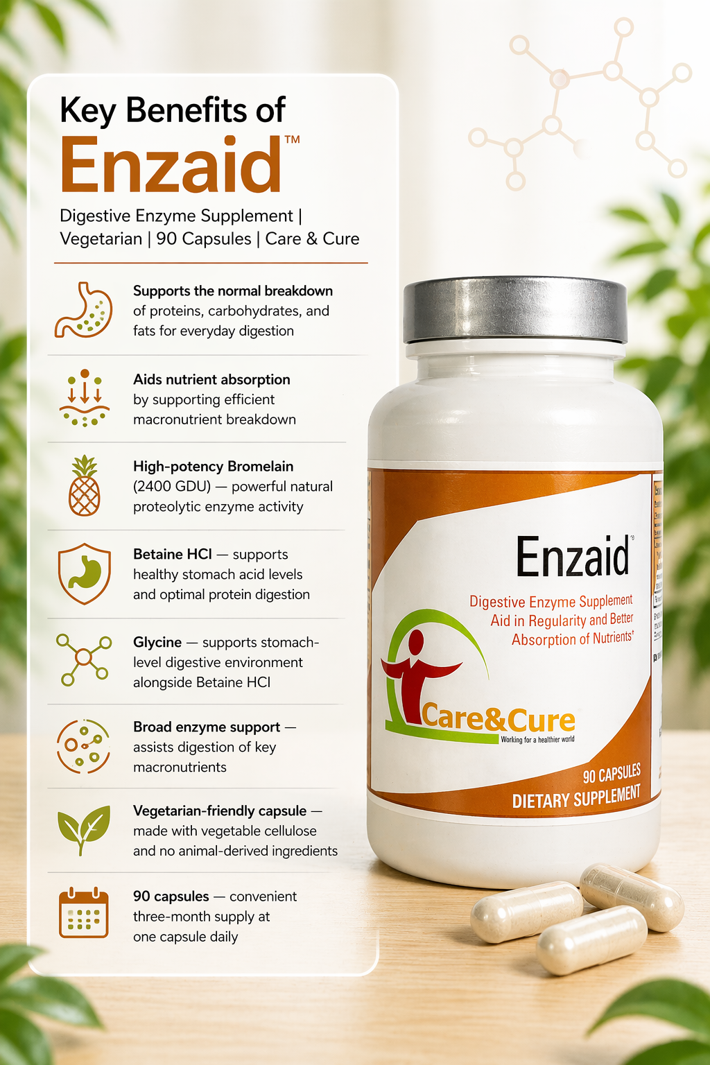 • Digestive Aid™ is manufactured in an FDA-registered facility in the USA, produced to GMP (Good Manufacturing Practice) standards. Every batch is made with the same commitment to enzyme quality, potency, and purity that defines everything we make at Care & Cure.