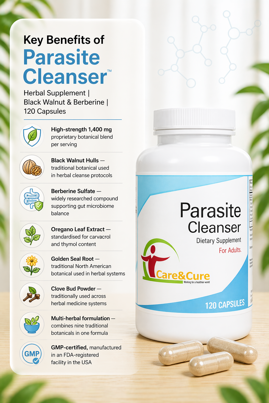 • 120 capsules per bottle — a full 60-serving, two-month supply